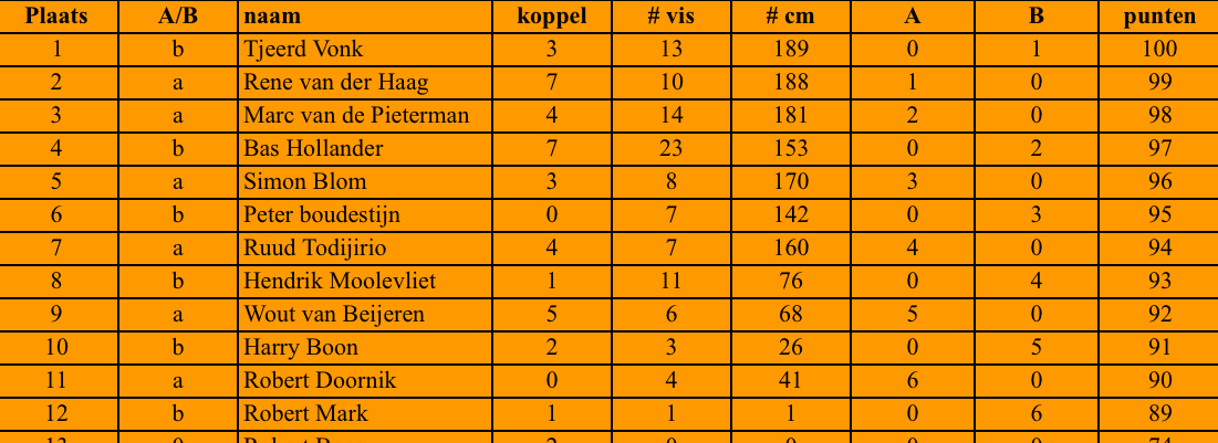 Binnen 6 minuten melde de eerste schar zich zou het dan toch. Hier en daar werd in het eerste uur vis gevangen van mini wijting tot mooie bot schar en wijting. Veel vissres haalde alles uit de kast lange lijnen korte lijnen dichtbij ver weg, ook de slijmvis liet zich amper zien omdat er te weinig goede putjes waren. Dus toch weer zoeken, en dan op eens bij Peter Boudestijn onverwacht een mooi triplet 2 schar en een mooie bot. Het was een moeizame visserij vandaag wel heeft iedereen vis gevangen. Op naar de volgende wedstrijd op 15 november .