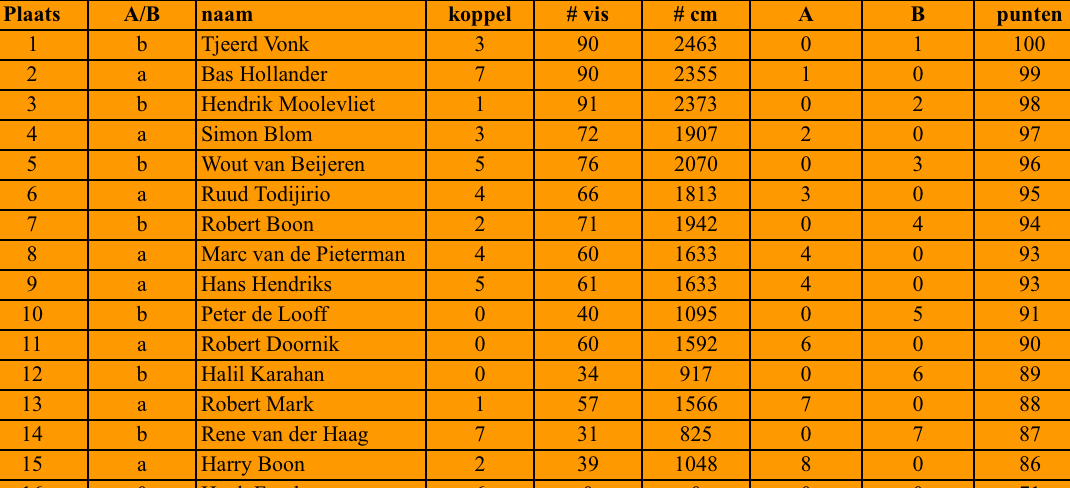 Op enkele vissers na is er goed gevangen hetgeen ook vooral lukte bij Simon (72ex), Wout (76), en onze Robert Boon (71ex) waar het nu eens meezat.